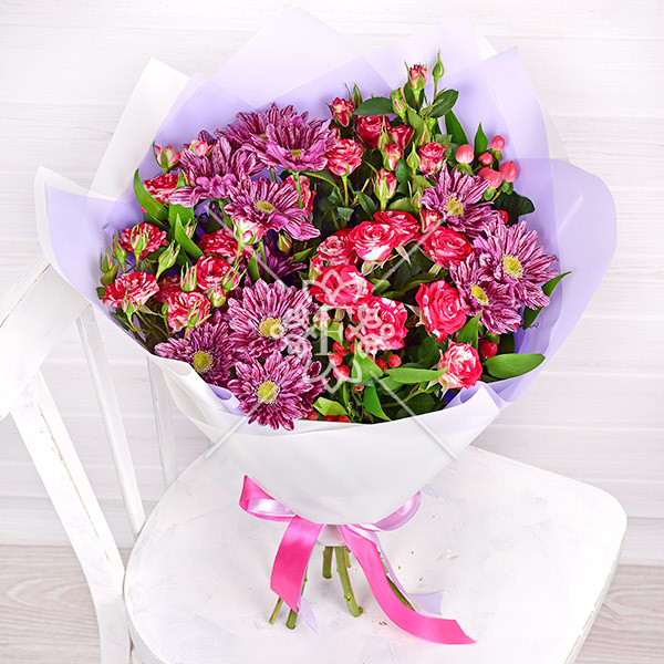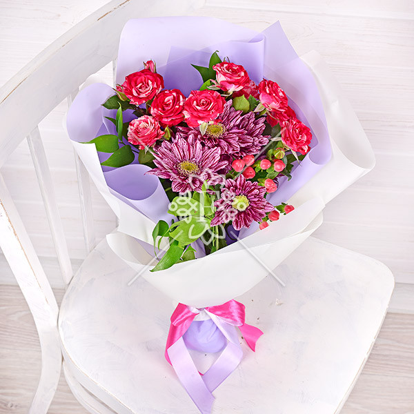 Букет составлен из чудесных кустовых роз и хризантем, украшен нежным и очаровательным гиперикумом. Цветы прекрасно сочетаются, выглядят гармонично и привлекают восторженный взгляд!